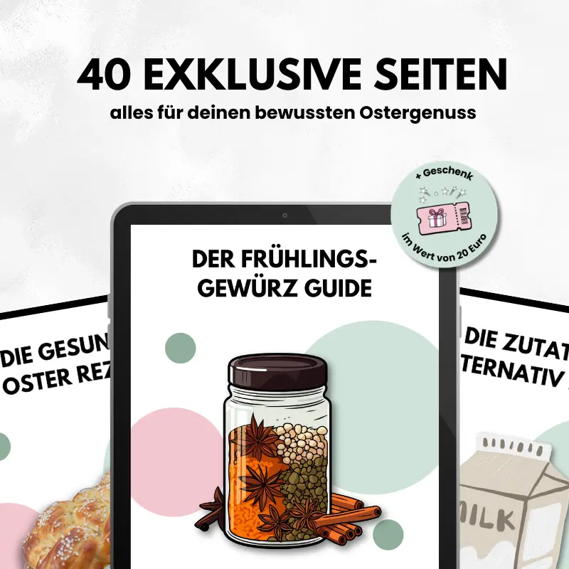 Neben vielseitigen Rezeptideen zum Backen, Naschen und für deinen Osterbrunch findest du einen exklusiven Frühlingsgewürz-Guide, mit dem du aus über 20 Rezepten mehr als 50 kreative Variationen entwickeln kannst, alltagstaugliche Tipps aus meiner langjährigen Erfahrung sowie durchdachte Alternativen für Allergien, Unverträglichkeiten und unterschiedliche Ernährungsweisen. Zusätzlich wartet eine besondere Überraschung auf dich, die dich auch über die Osterzeit hinaus begleiten darf.
